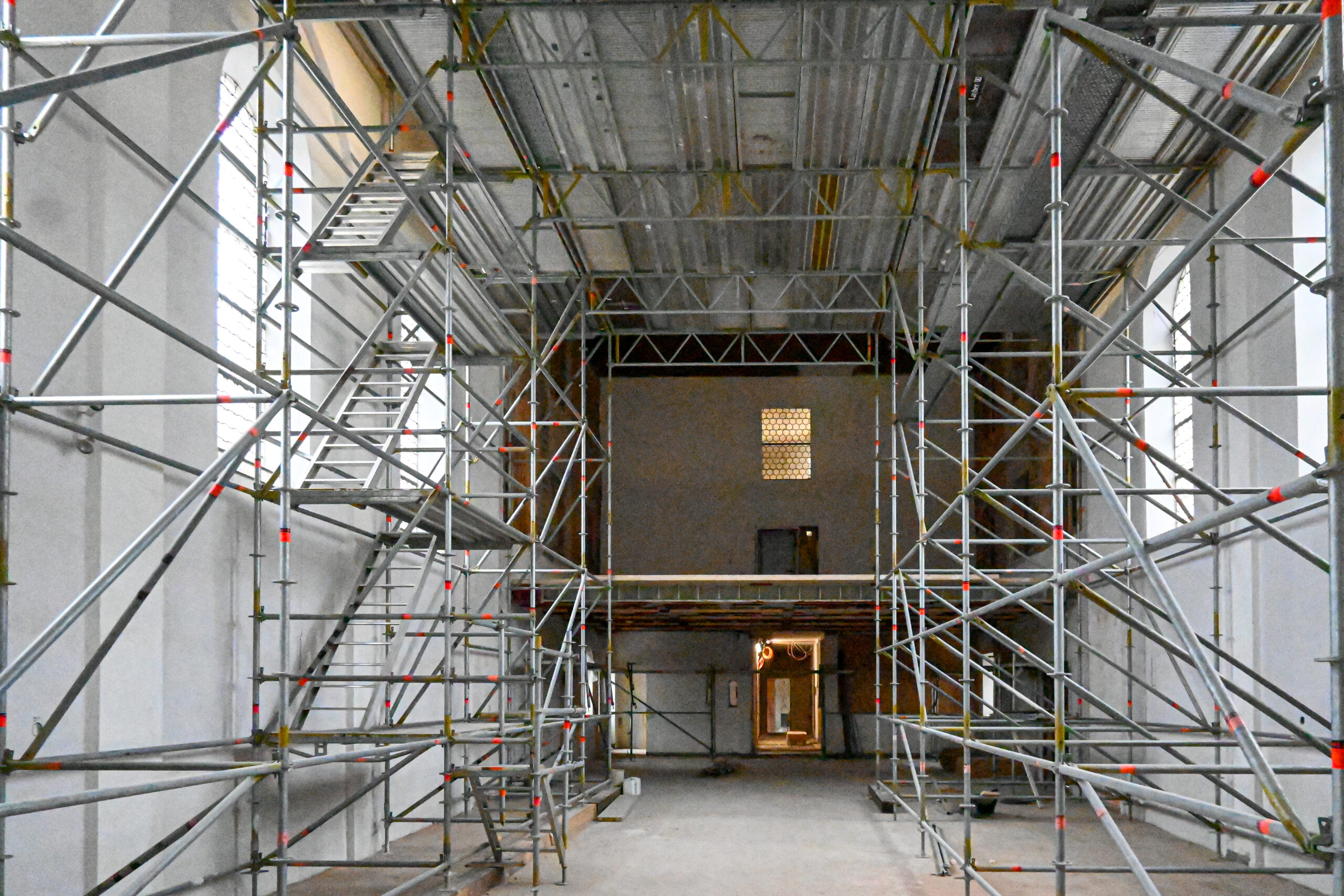 In der Franziskuskapelle wird der Einbau der neuen Empore und die Wiederherstellung der historischen Fassade vorbereitet.