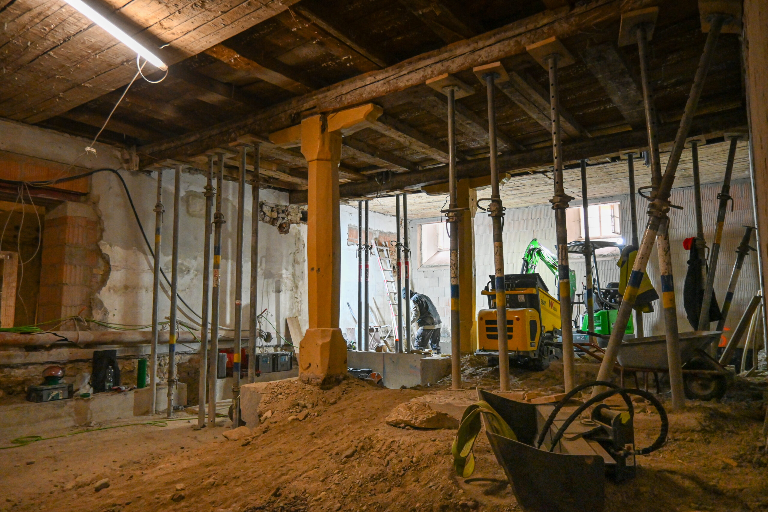 Im Untergeschoss werden Fundamentunterfangungen für die Herstellung der Barrierefreiheit und der Vertiefung des vorhandenen Fahrstuhlschachts betoniert.