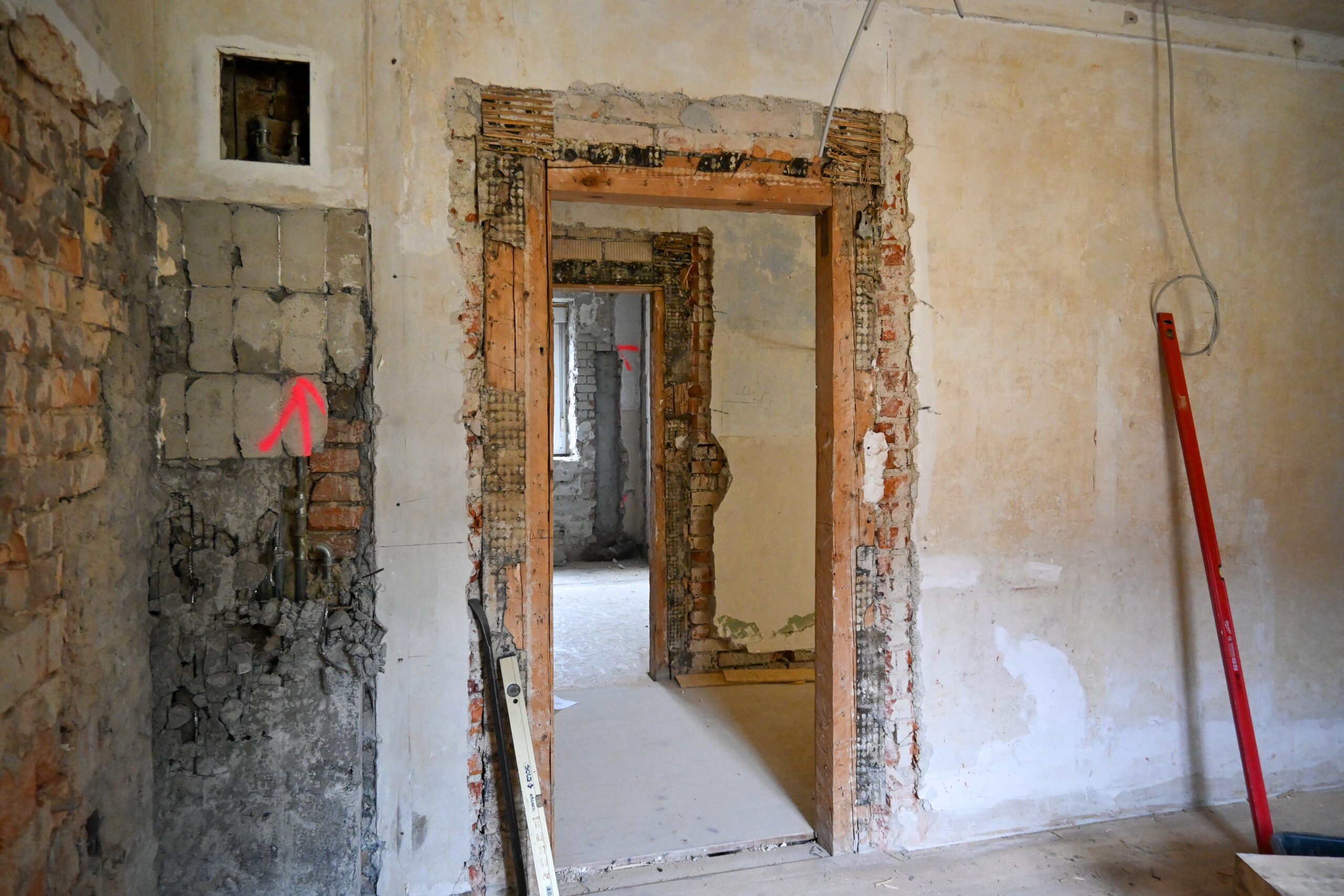 Im Mutterhaus arbeiten sich die Rohbauer von oben weiter nach unten durch. Der alte Putz wird abgeschlagen und die Innenseiten der Außenwände freigelegt. Sie werden später mit einem Dämmputz neu aufgebaut.