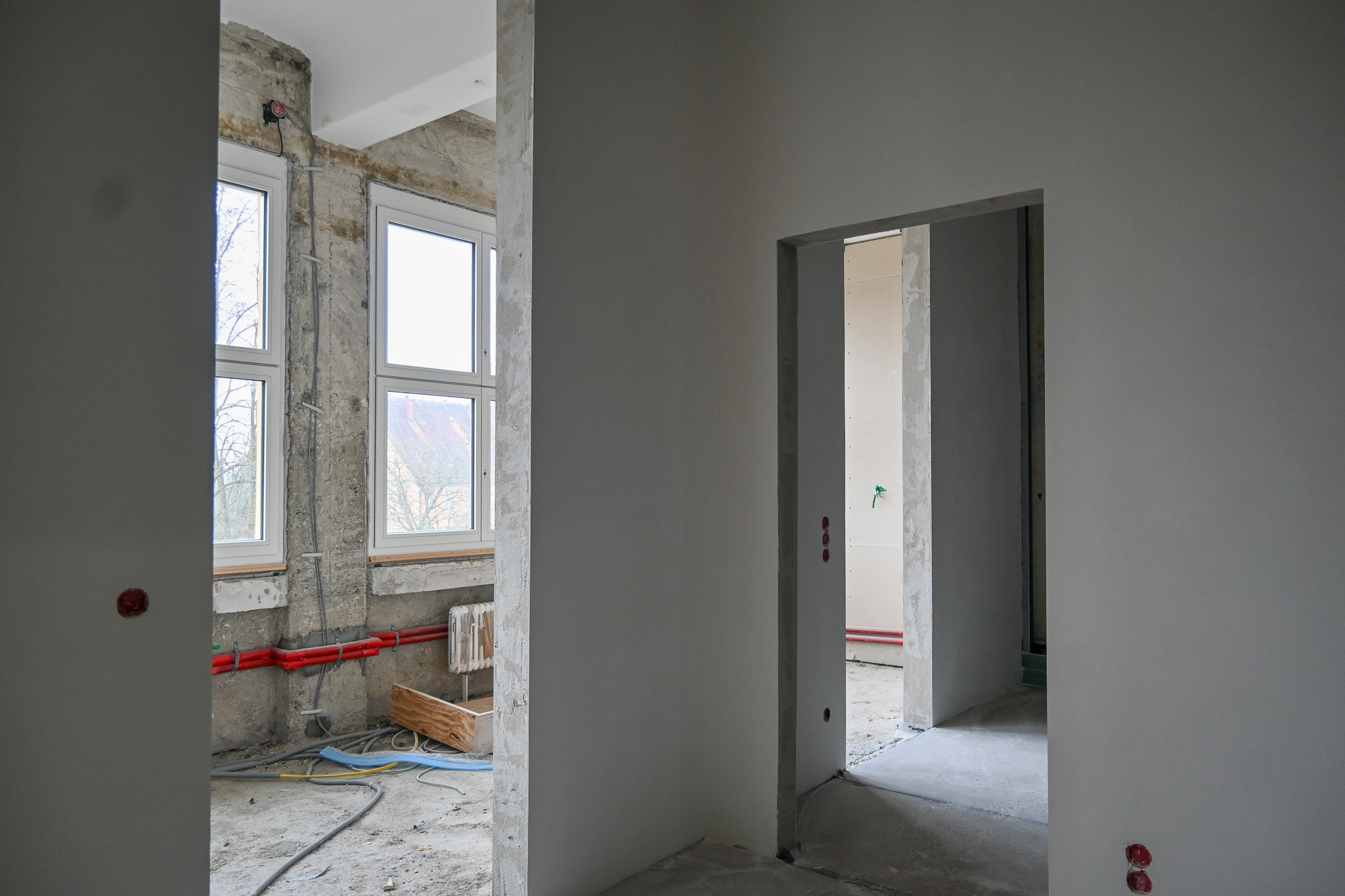 Auf den Konventsgeschossen im Mutterhaus werden die Trockenbauarbeiten für die neuen Funktionsboxen in den Gemeinschaftsräumen der Schwestern ausgeführt.