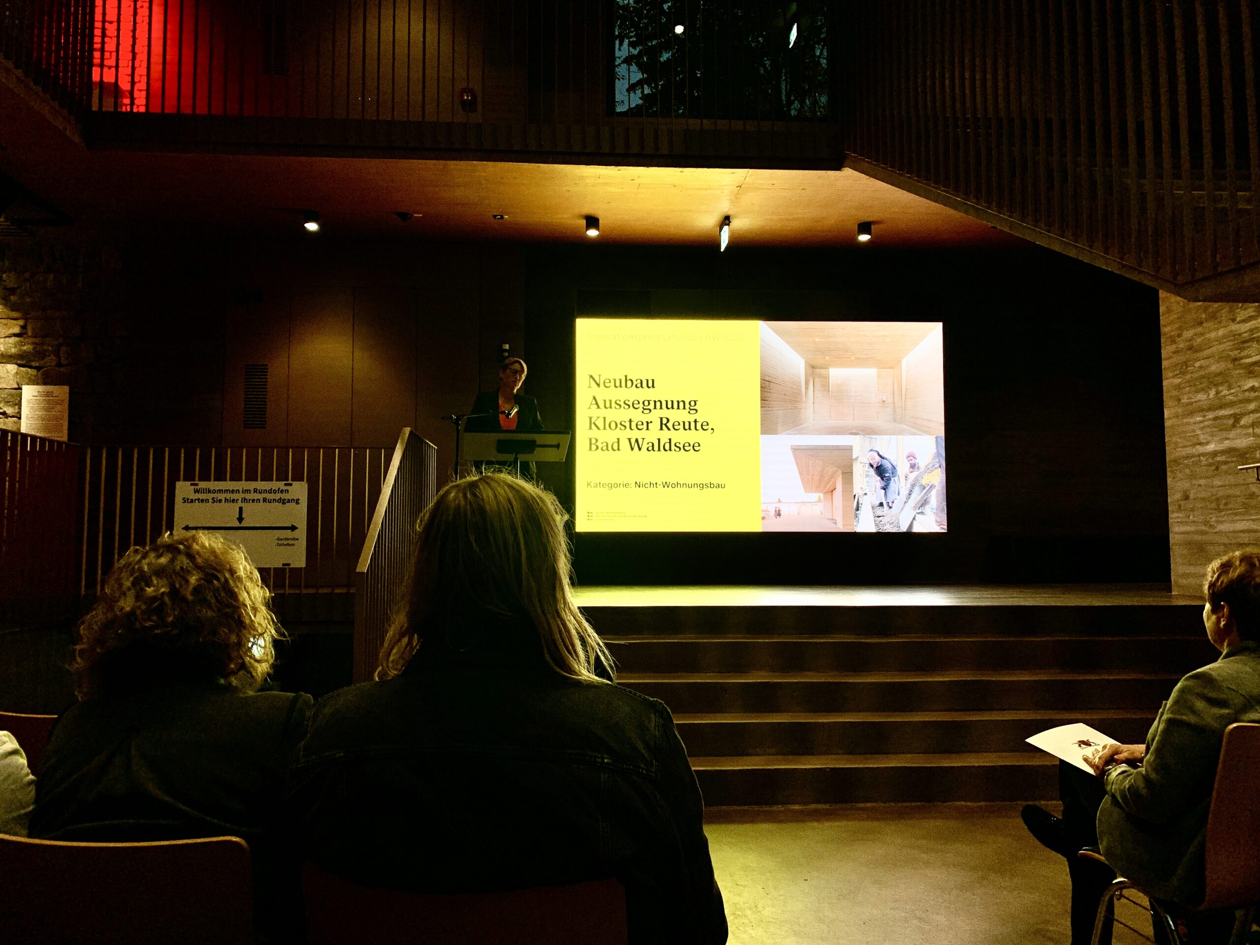 Als ein sakrales Bauwerk in herausragender Qualität hat Staatssekretärin Andrea Lindlohr die 2023 eingeweihte Aussegnung auf dem Klosterfriedhof in Reute gewürdigt. Am 23. Oktober überreichten sie und Ministerin Nicole Razavi MdL die Urkunde mit der Auszeichnung an Generaloberin Sr. Maria Hanna. Der Innovationspreis Lehmbau BW wurde in Zell am Hammersbach verliehen, zusammen mit der Aussegnung an weitere Preisträger und deren innovativen Projekte.